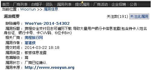 3月22日晚,乌云平台透露:携程将用于措置用户付出的办事接口开启了调试功能,使所有向银行验证持卡所有者接口传输的数据包均直接保留在本地办事器。同时因为保留付出日记的办事器未做校严格的基线安然建设,存在目次遍历缝隙,导致所有付出过程中的调试信息可被肆意骇客读取。这些信息包含持卡人姓名、身份证、银行卡类别、银行卡号、CVV码,6位Bin。此次事务再次让互联网用户数据安然成为存眷核心。为企业在数据防泄密扶植方面敲响警钟。