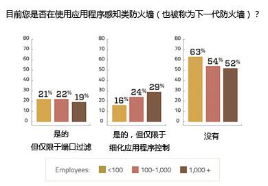 或许我们可以经由过程不只一种编制来解读“下一代”防火墙,但在此次查询拜访傍边我们的存眷重点是“利用法度感知”防火墙——也就是夸大年夜防火墙在措置流量的同时感知与会话相干的利用法度的能力。因为这类防火墙的复杂程度更高,是以对措置能力的依托性也更强,总而言之,如许的防火墙很难摆设成功,但全球受访者中有43%暗示他们已在利用。
