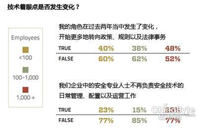 在小型企业傍边,稍稍超越半数的受访者暗示安然手艺工作并未呈现改变,而大年夜型企业在这一标题问题上的不雅点却呈现了必然程度的***。仍有四分之三的受访者觉得建设与手艺属于安然从业人员的首要角色定位,但这一结论与他们地点企业的实际范围并没有联系关系。