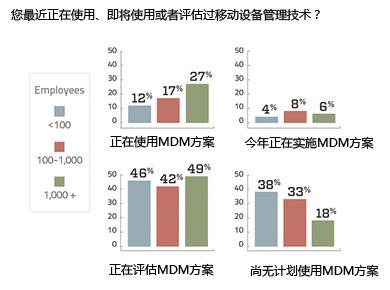 在更加遍及的移动设备节制范畴(其实不但限于安然标题问题)移动设备治理(简称MDM)的人气迎来大年夜幅升温,这一点在大年夜型企业中表示得尤其较着。在员工数量超越一千人的美国企业傍边,约有一半已于2013年对MDM方案进行评估,而约有四分之一的受访者更暗示地点企业已开端利用MDM方案。