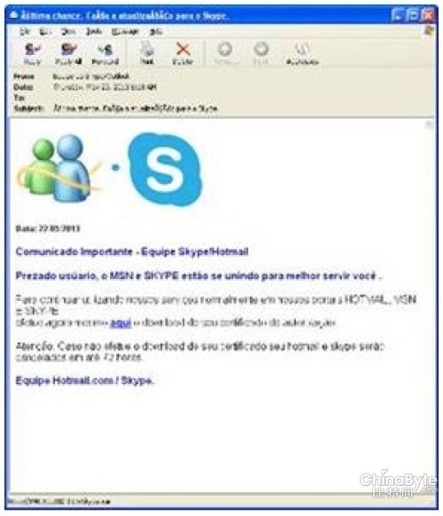 假充Skype官方名义发送的假“要求下载授权凭证”邮件样本
