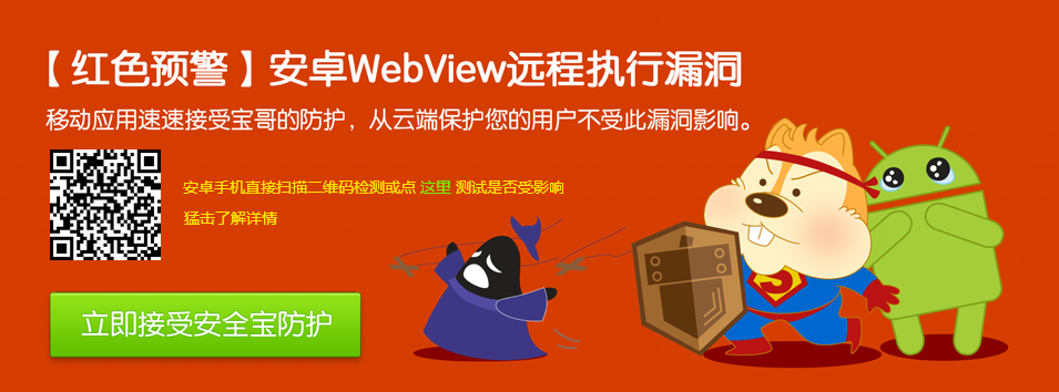 近日,安卓利用系统爆出了WebView安然缝隙,该缝隙导致大年夜量移动利用成为黑客管道,向用户长途安装歹意软件,而今朝所有手机安然软件还没有法防御此威胁。对此,安然宝启动应急响应机制,推出了在线缝隙检测东西,安卓手机用户可拜候安然宝首页(www.anquanbao.com),直接扫描二维码测试本身的手机是不是受缝隙影响(也能够扫描下图中的二维码进行检测)。对检测出受缝隙影响的手机用户,可以安装颠末安然宝加固的“上彀快鸟”进行防护。同时,安然宝已实现了针对该缝隙的歹意代码挂马的反对,开启了安然宝的网站可以防御此类挂马。建议移动利用开辟者将本身的网站加进安然宝,呵护您的用户不受此缝隙影响。