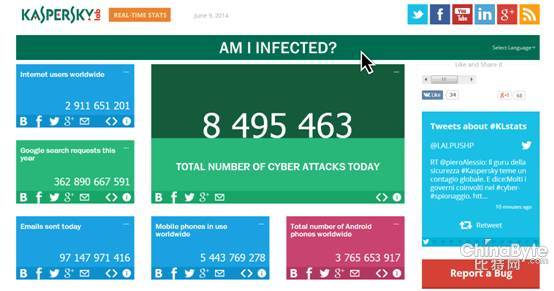 为了反映更全面的情况,除了网络威胁数据外,kaspersky-cyberstat.com网站还提供了全球范围互联网用户的数量统计数据,包括最近才开始使用互联网的用户数量。通过访问该网站,访问者能够了解过去一年全球发送的邮件数量、过去24小时发布的博客文章数量或tweet信息数量、今天全球手机的销售额以及被攻陷的网站数量等信息。