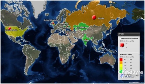 根据卡巴斯基实验室专家的分析,目前Miniduke的受害者包括政府机构、外交组织、能源部门、电信运营商、军事承包商以及非法违禁物品交易者。而通过卡巴斯基实验室专家截获的一份受害者名单来看,受到CosmicDuke攻击最为频繁的国家有格鲁吉亚、俄罗斯、美国、英国、哈萨克斯坦、印度、白俄罗斯、塞浦路斯、乌克兰和立陶宛。