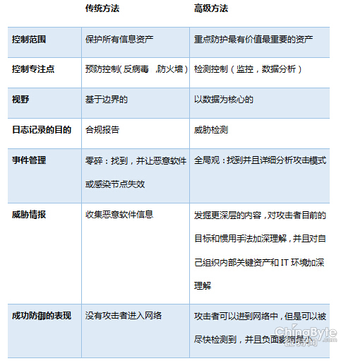 参看上表中的“高级方法”,与传统的方法相比,更加注重对核心资产的保护(多了也保护不过来),技术手段上更加注重检测技术(正如NIST SP 800-137提出的持续监控的概念一样,美国政府的爱因斯坦计划精髓也在于此),以数据为中心(尤其是出去的数据),分析日志(例如借助SIEM/LM)更多是为了检测威胁,注重攻击模式的发现和描述,从情报分析的高度来分析威胁。